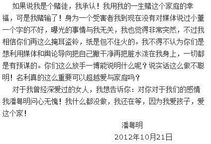 婚变传闻散开后,女方率先发起责难,嗜赌成性、家暴、性无能等丑闻一时之间全扣在潘粤明身上。