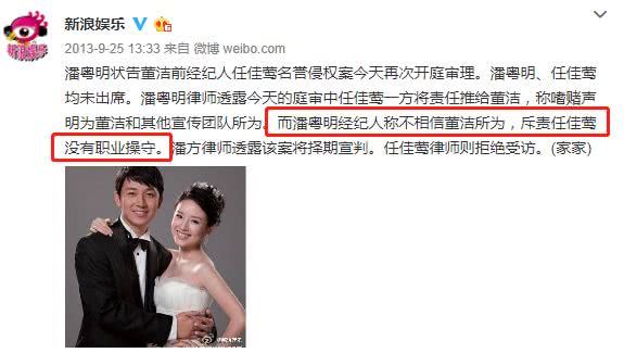 然而,事实是女方被爆出轨,她的经纪人因污蔑诽谤潘粤明,被法院判决向其致歉,并赔偿4000元。