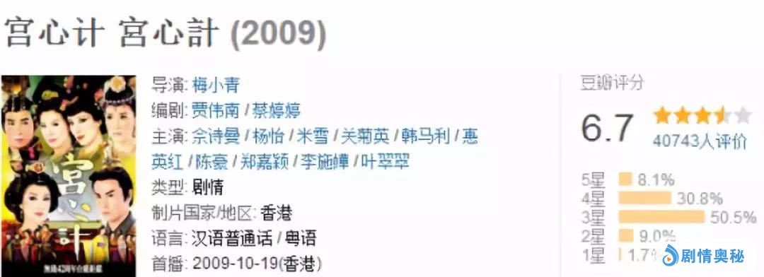 《宫心计》的收视也很喜人,以平均46点,最高50点成为2009年度香港电视剧收视冠军。