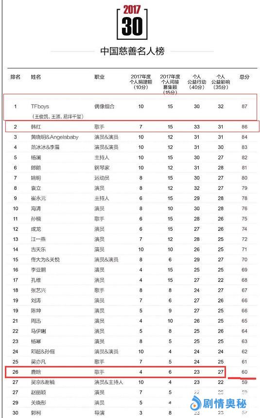 2018年1月31日,《中国慈善家》揭晓了“2017中国慈善名人榜”,韩红排名第二。