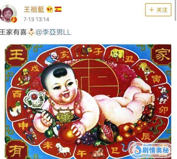 2018年7月13日,王祖蓝社交平台发文:“王家有喜”,宣布妻子李亚男怀孕喜讯,并配上一张年画娃娃的照片,表达自己兴奋的心情!随后李亚男转发晒出B超照并配文:“今天是我们拍拖9周年纪念日,很兴奋感恩可以在这个特别的日子,宣布我和祖蓝将迎接一个小生命来临。”