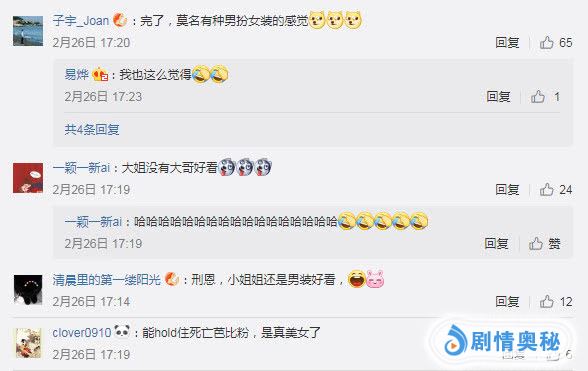 “大姐没有大哥好看!”不过话说回来,看惯了“哥哥”英俊潇洒的男装打扮,莫若菲换回女装,粉丝们反而有些许得不习惯!在他们看来,一身浅粉的女装相对于男装毕竟有点花里胡哨,更别说穿在演员身上的还是十分挑人的粉色!一身英气被削弱了几分,原本整整齐齐的发束,也变成了齐腰长发和小辫子,还梳起了刘海,这是担心观众们不知道演员本体是个帅气的小姐姐吗?