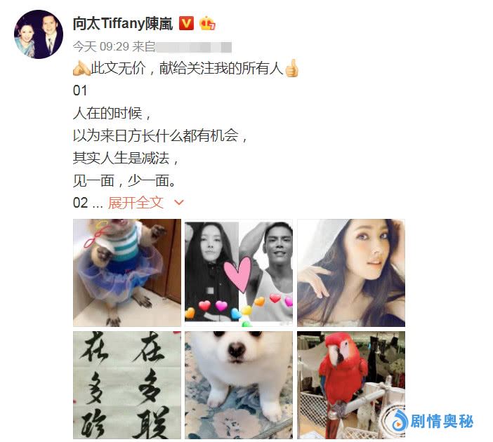 向太一大早就在微博中写了一大段鸡汤,表示这是献给所以关注她的人,结果网友们根本没时间看内容,瞬间就被配图给吸引了,中间一张就是郭碧婷与向佐的照片,向佐还很有心的P好多个小爱心第三张放的是郭碧婷的单人照,连儿子向佐都没能有这样的待遇啊,看来向太是真的很喜欢郭碧婷这个儿媳妇。