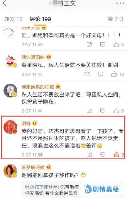 谢娜在2月27号11点56分辟谣说:我的妈呀,帮杰哥的表哥看了一下孩子,而且还不是照片里的孩子,路人说话不负责任,也这么不靠谱,差评。