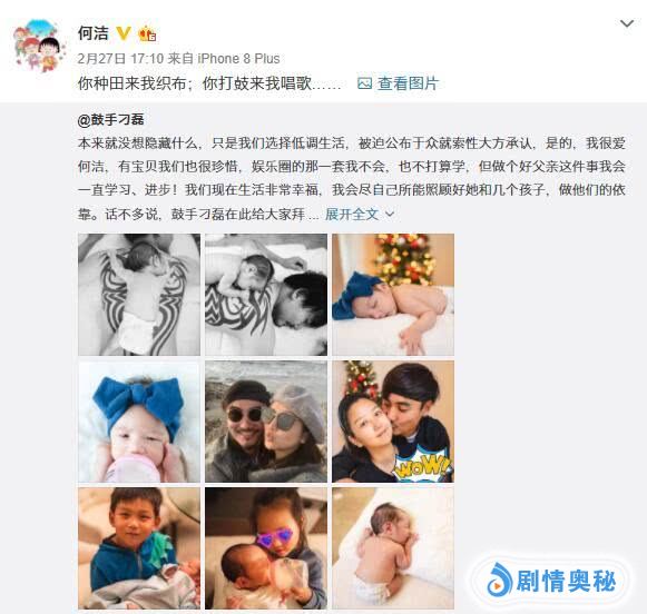 2月27日,何洁的男友刁磊微博晒出何洁三胎的孩子,称本就没想隐瞒什么,只是不想被打扰,何洁随后转发了该微博,配文“你种田来我织布,你打鼓来我唱歌……”