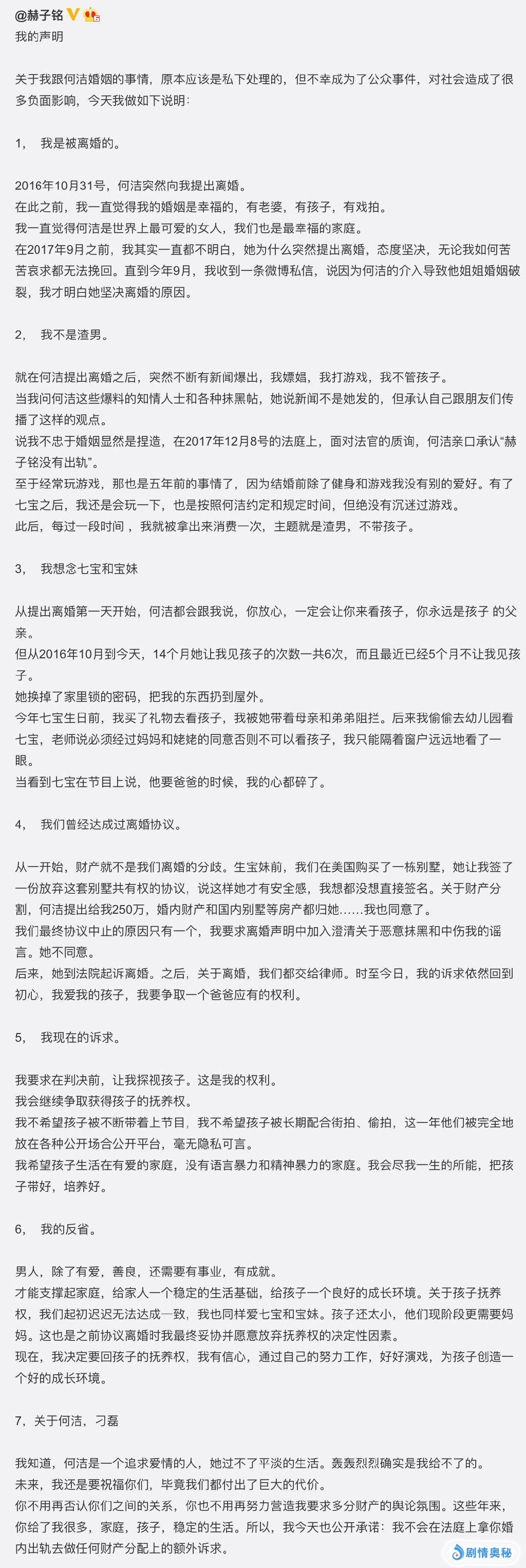 郝子铭称自己并不是渣男,打游戏也是在何洁规定的时间,而且在离婚官司的时候,何洁亲口在法庭上承认“郝子铭没有出轨”,反而是对方不让自己探视两个孩子,还到处散布抹黑自己的谣言。