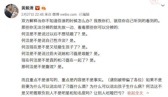 黄毅清晒出这些之前的声明,明显就是针对何洁与刁磊,一连用六个问号来打脸!何洁是不是说过以后不想结婚了?是。何洁是不是说自己性冷淡?是。何洁现在是不是又结婚生孩子了?是。何洁是不是说过前夫说她和刁磊是栽赃?是。现在何洁是不是真的和刁磊在一起了?是。那何洁是不是撒谎?是。