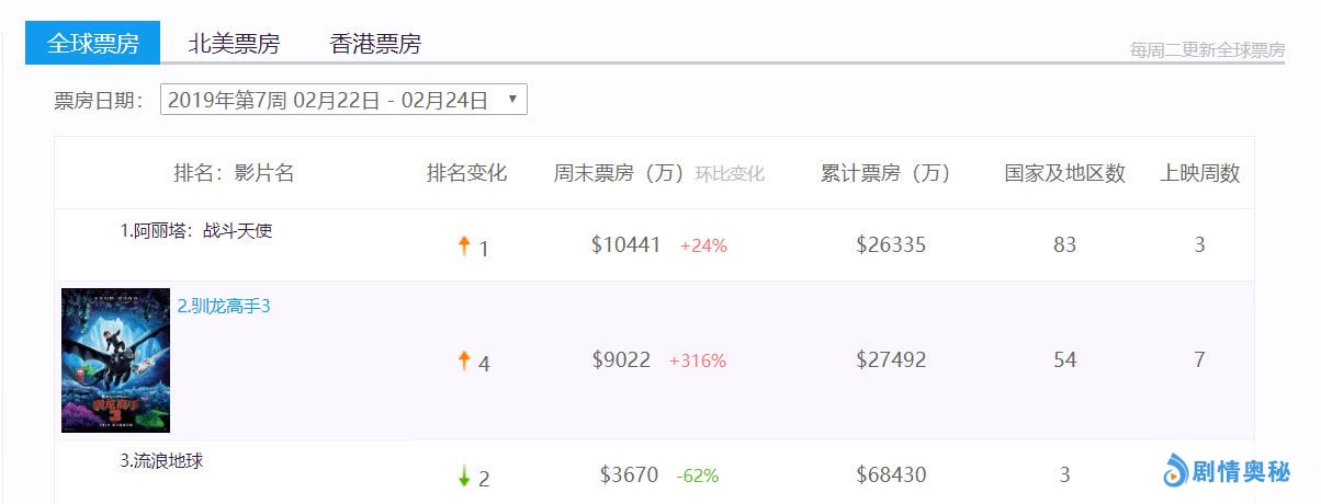 虽然离《驯龙高手3》内地3月1号上映还有2天时间,但其实该片在海外市场早已大规模上映。在今年第七周的全球票房榜上,电影还力压《流浪地球》夺得票房亚军!截至2月24号电影在全球54个电影市场上映,累计票房突破了2.74亿美元,约合人民币就是18亿!