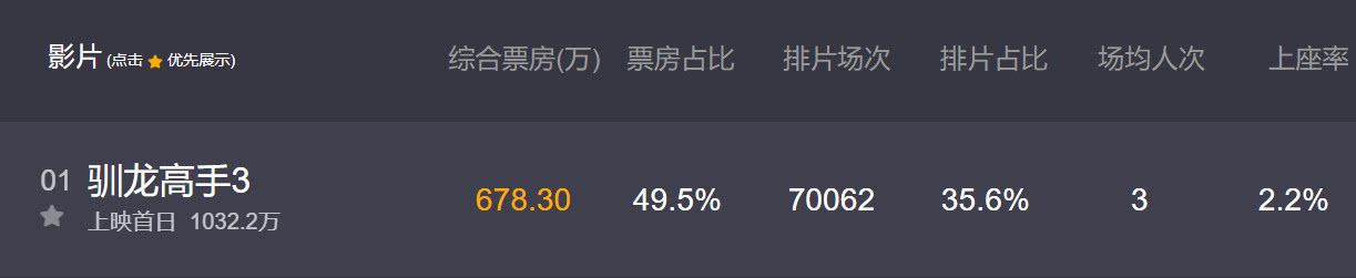 截至2月27号23点《驯龙高手3》离内地上映还有两天,电影首日预售票房为678万。预排片为35.6%,不出意外的话电影击败《阿丽塔》夺得日票房冠军还是跟轻松的。不过由于动画片的题材限制,加上3月8号《惊奇队长》杀到,这部《驯龙高手3》内地市场预测票房在6亿左右!