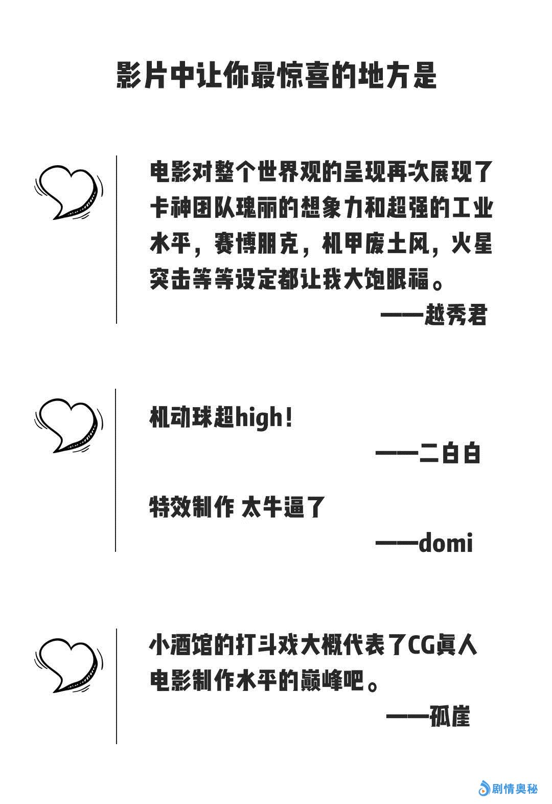 接下来我们看看,这部电影对大家来说,最惊喜,做得最好的地方是哪里吧。几乎多有的答案都指向了两个字: