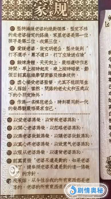 “坚持拥护老婆的绝对领导”、“家里老婆第一,孩子第二,我第三”、“爱护老婆,做文明老公,坚决做到打不还手,骂不还口,打了左脸送右脸”......