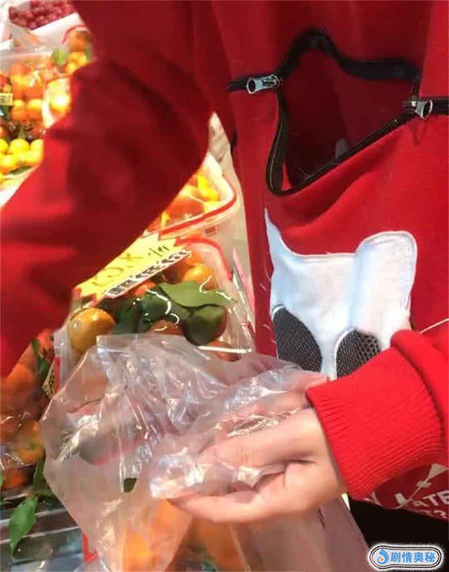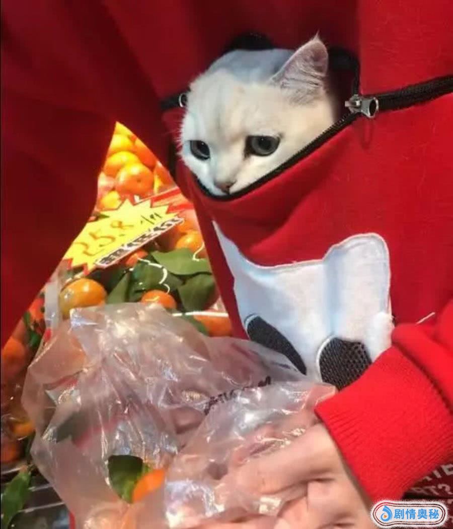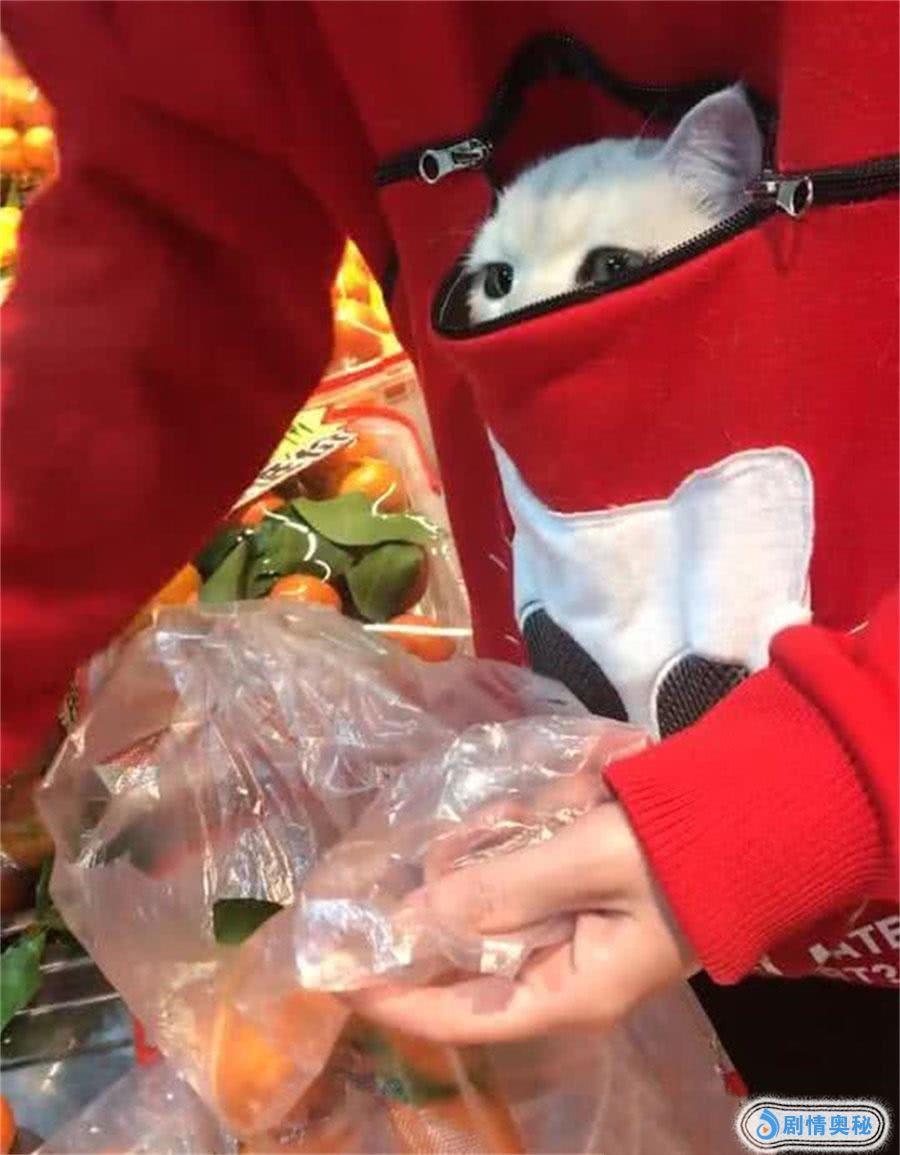 小姐姐穿着的是一件红色的卫衣,而卫衣的腰上有一条黑色的拉链,拉链拉开之后是一个很大的口袋,一般人都是用来装饰的口袋,到了小姐姐这里就有了个很好的用法,小姐姐带猫咪出门要是穿了这件衣服,猫包都可以不用带了,由于小姐姐的猫咪并不大,直接把猫咪装进口袋就可以了。当这位小姐姐挑橘子的时候,这个小猫咪就露出个头来着外面的一切,不得不说看上去非常的萌啊。