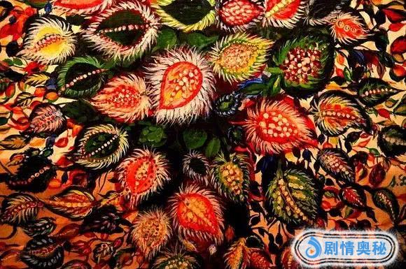 萨贺芬的画作,色彩斑斓、造型奇特,多由一些花瓣和树叶组成,仔细凝视时,还能发现一只只诡异的眼睛…