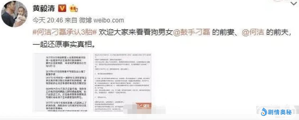 2月27日何洁和刁磊大方的承认她们在一起了,并且有了女儿后。黄毅清发了个微博,可以说是吃瓜群众中,看热闹不怕事大的。黄毅清大家都知道,没事就diss前妻黄奕的神奇男子。前一阵子还说黄奕是同性恋。在微博公开了,刁磊前妻的朋友圈。