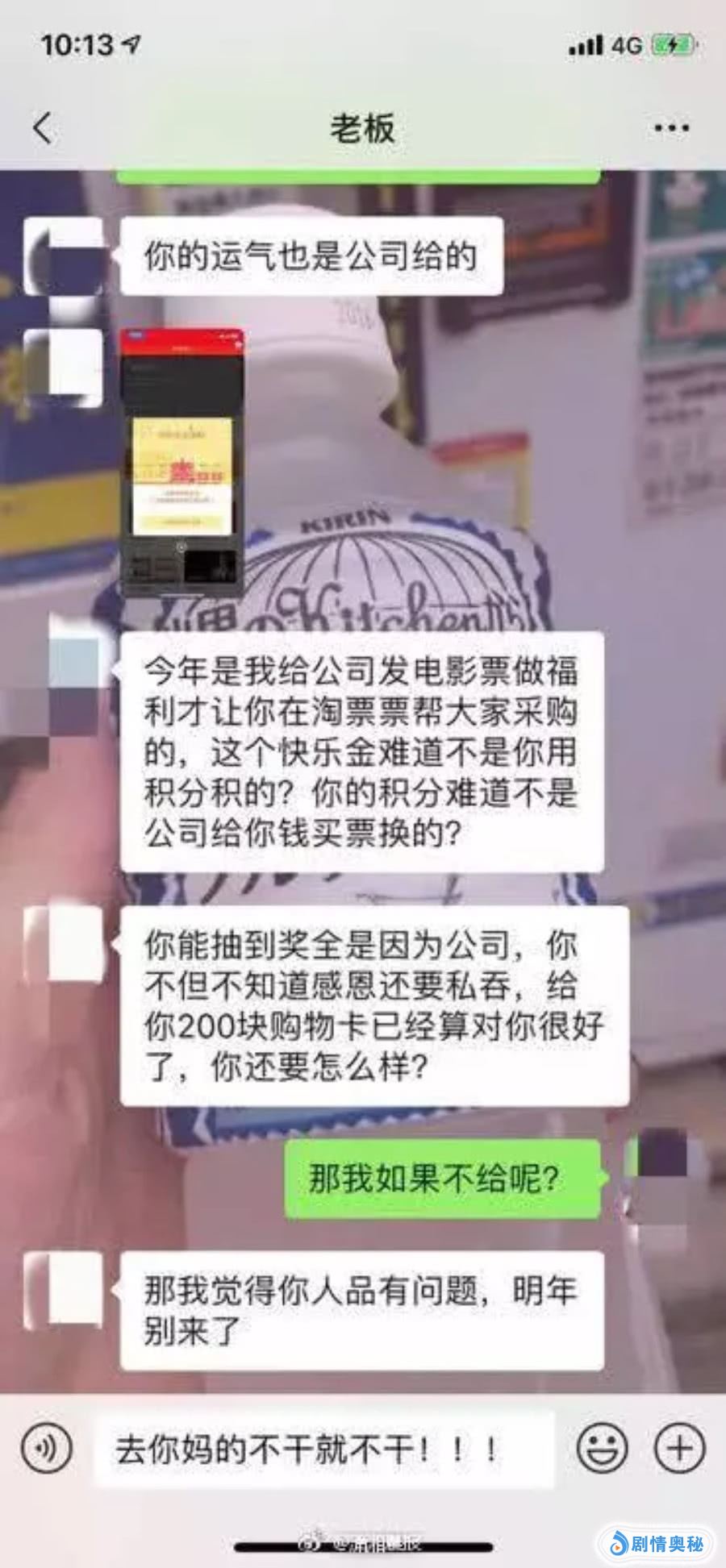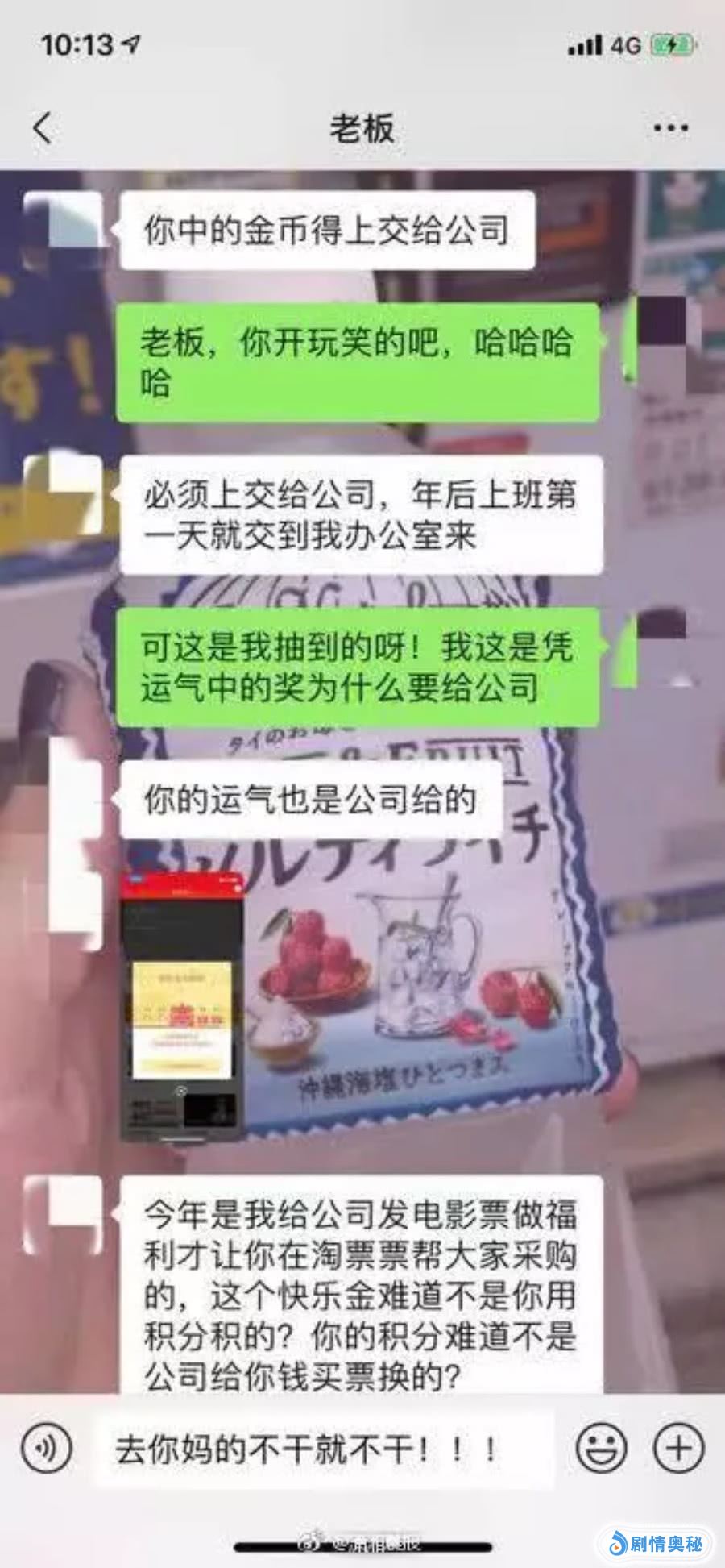 被老板看到了,老板说,你抽到的金子也是属于公司财产,必须上交,如果不上交,就要被开除,老板还说如果不上交,那就是说我人品有问题,因为最近许多公司都在裁员,又怕找不到好的工作,但又不服老板的这个说法。老板说,你把这个黄金上交,然后我用200元的购物卡,给你作为补偿,我心里想了,我自己中的奖,为什么几千块钱就变成200块钱了?老板说你不要跟我抬杠,否则你连这200都没有。