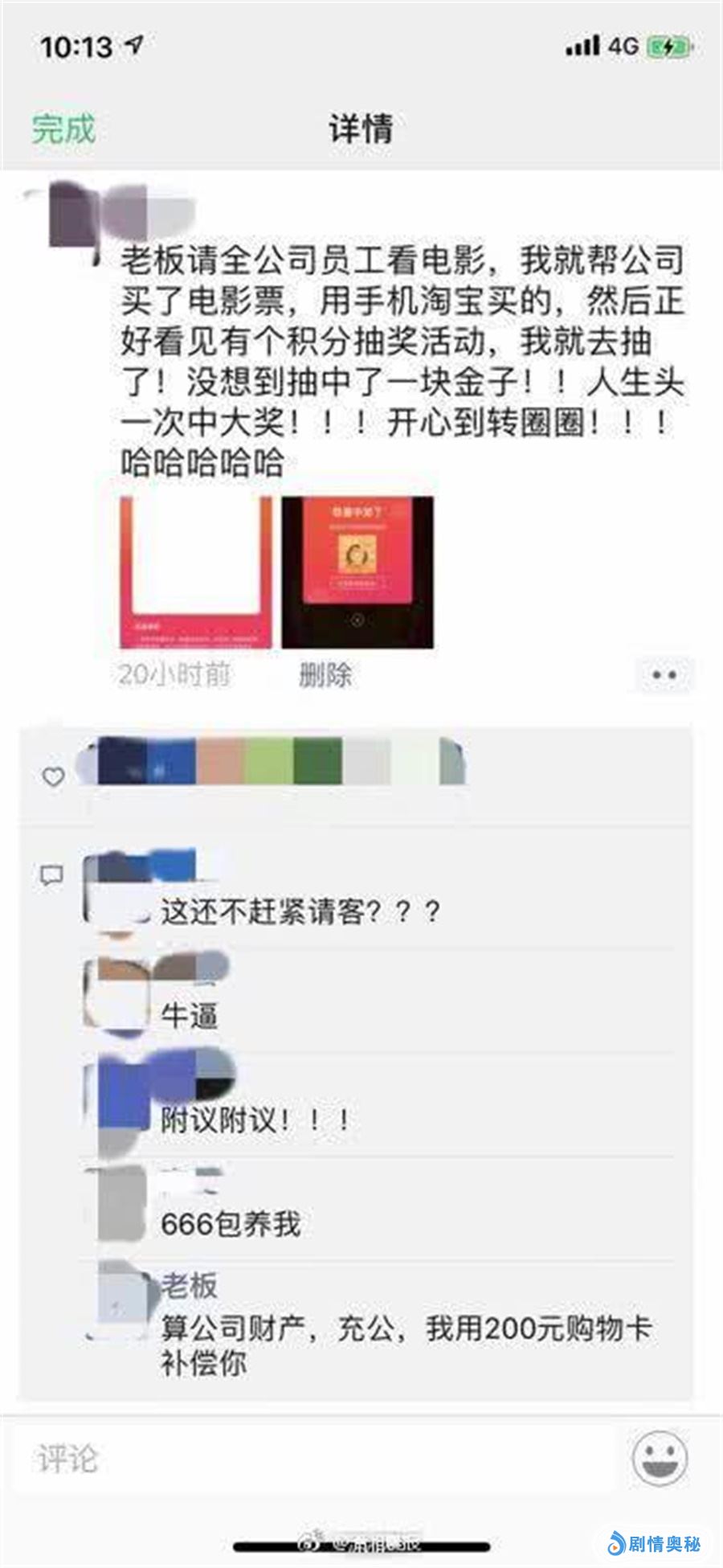 就在最近,一位上海的网友在网上发表了一篇文章,,引起了许多人的围观。他说自己放假第1天就被老板炒了鱿鱼,原来他是在公司做财务的,后来老板叫他替公司买电影票,算是年终的福利奖,后来,他用自己的淘宝账号买了几十张电影票之后,官方还给了一个抽奖的活动,他抱着试一试的态度去抽了一个奖,没想到抽到了金子,后来就把这条中奖信息发到了朋友圈。