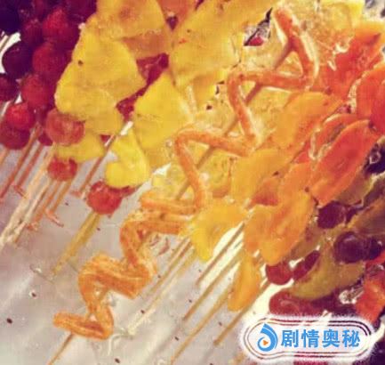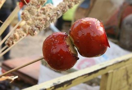 其实较早期,比较另类但是我们还能勉强接受的糖葫芦品种,就属糖苹果了,我们经常看到一个扎着糖葫芦的大扫帚上面,还插着一个糖苹果,一个竹签上面只差了一个苹果,外面裹上厚厚的糖稀,咬起来脆脆的,没有点咬合力你还真吃不到呢!不过这还算是比较初级一点的产品。