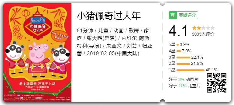 因为《啥是佩奇》掀起传播声量的《小猪佩奇过大年》,终于因为糟糕的口碑,败坏了观众的胃口(豆瓣4.1分),2亿的天花板看起来遥不可及。营销神话抵不过电影质量,谁再说观众没眼光,那是傲慢无知,啪啪打自己的脸。
