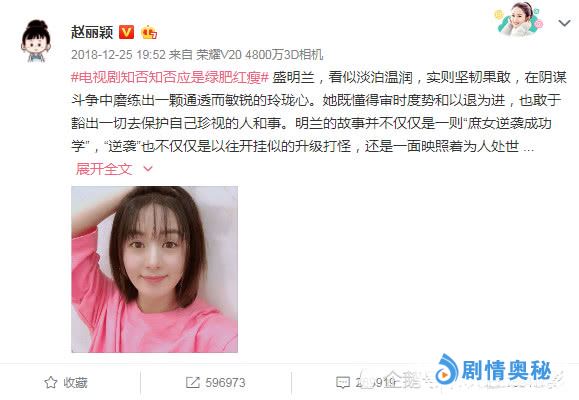 再对比一下最近凭借《知否知否应是绿肥红瘦》再次爆红的赵丽颖,她的微博粉丝有8393万,日常微博转发只有25万左右,评论也差不多只有10万,相当于125个吴京单位,不过赵丽颖的数据上看的话应该不假。
