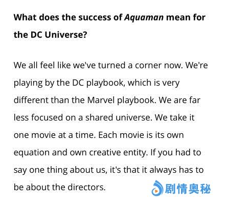 他回答:“我们都觉得我们如今换方向了。我们搞得的是DC剧本,跟漫威剧本非常不同。我们更少关注共享宇宙。我们一次拍一部电影。每部电影都它自身的公式,自身的创意实体。如果关于我们非要说的一件事,就是那些总是取决于导演们。”