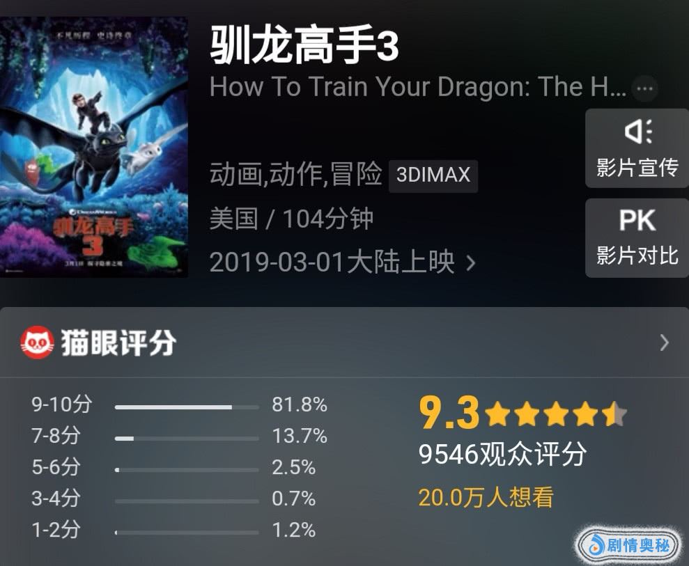 梦工厂的动画电影《驯龙高手3》3月1日在中国上映,口碑立即大爆,目前电影在猫眼的评分达到了9.3分,成绩相当不错。