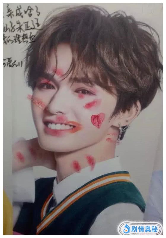 朱正廷的这张海报,就有点不忍直视了,不仅脸上被口红印霸满,连脖子、手腕都不放过,只要是露肉的地方,都留下了粉丝对他满满的爱。哎,这样疯狂真的好吗?