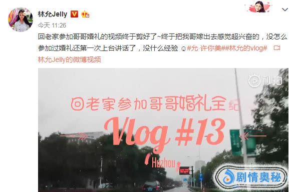 3月1日,林允在微博更新了第13个vlog。“回老家参加哥哥婚礼的视频终于剪好了~终于把我哥嫁出去感觉超兴奋的,没怎么参加过婚礼还第一次上台讲话了,没什么经验。”这回让小姐姐兴奋的理由是可以参加亲哥哥的婚礼。