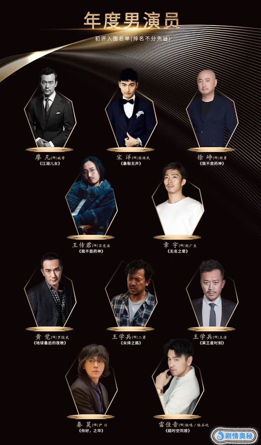 年度男演员初选名单,《我不是药神》贡献了2个提名,分别是徐峥与王传君,他们在电影中的表现让人印象深刻,章宇则凭借《无名之辈》入选。