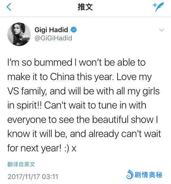 2017年维秘在上海举行,吉吉在社交网站上称自己会参加此次维密秀,却遭到网友们的强烈抵制并拒绝其来上海参加大秀,随后吉吉又表示自己来不了,发文称“对于缺席今年的上海维秘秀,是如此地沮丧,我爱维秘大家庭......”