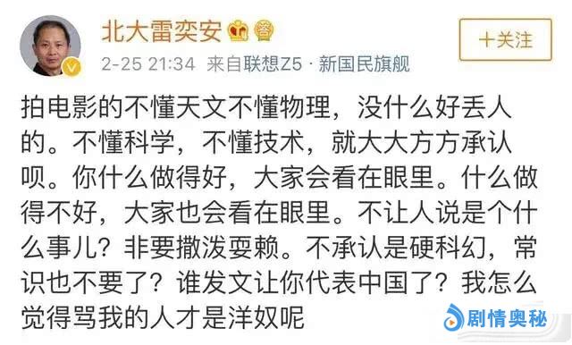 《流浪地球》在火爆之后,一名自称为北大教授的人就说郭帆不懂天文不懂物理,什么都不懂,把《流浪地球》乱拍乱……在被北大教授怒怼后,如今就又轮到一位自称为周星驰的导演的人来说郭帆的不是了。