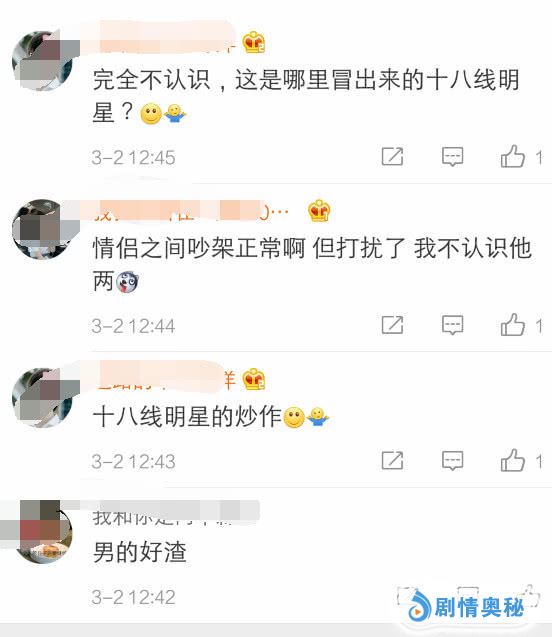 网友讽刺说:完全不认识,这是哪里冒出来的十八线明星?情侣之间吵架正常,但打扰了,我不认识他们俩。