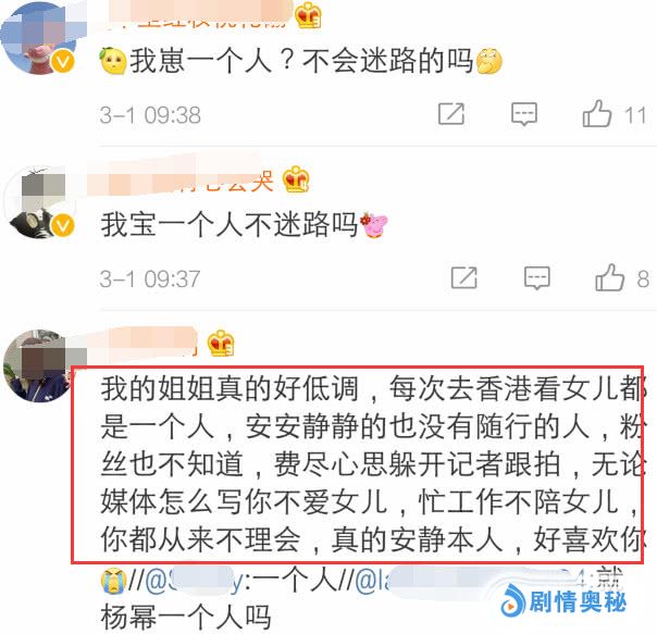 杨幂的一个资深粉丝留言说:我的姐姐真的好低调,每次去香港看女儿都是一个人,安安静静的也没有随行的人。粉丝也不知道,费尽心思躲开记者跟拍,无论媒体怎么写你不爱女儿,忙工作不陪女儿,你都从来不理会。