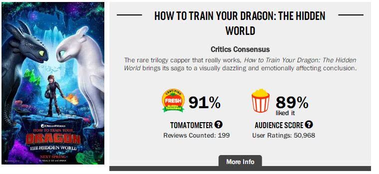 时隔5年,完结篇《驯龙高手3》正式回归。电影也非常有底气,早早开启了各大评论网站的影评人分数——Metacritic的71分,烂番茄的91%的新鲜度。这些数据都证明了它是一部值得期待的电影。