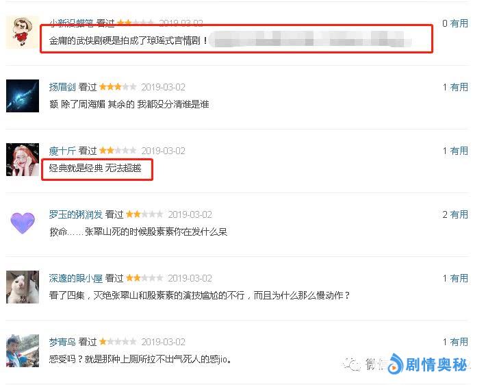 除此之外,该剧的群戏也不精,脸上的表情都尽显浮夸成分,甚至在唯一值得回味的武打戏份上都令观众不如意。除了给观众尬笑,似乎毫无亮点而言。而对于这样被翻拍多次的武侠片而言,该剧版本几乎是不如意的,甚至可以说都不如之前热播的《新神雕侠侣》,至少后者起码可以顺畅看完,而前者几乎更多的是给人一种弃剧的想法。