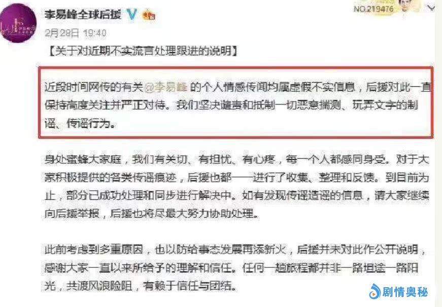 但近日,李易峰全球后援也发表了声明。关于李易峰个人感情的问题纯属是谣言,看来这些子虚乌有的信息都是假的了。当然李易峰的个人感情问题备受关注的,不知道峰峰的灵魂伴侣会是谁呢?