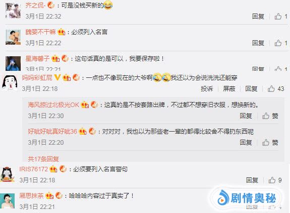 “这真的是不按套路出牌,不过都不想穿旧衣服,想换新的。一点也不像现在的大爷啊......我要保存啦”苏大强瞧着很时尚的看法,倒是引起了一些网友们的共鸣。既是一部家庭情感剧,他们没想到的是里面的老一辈竟然也有紧跟潮流的人。一般关于老人的影视形象无不与古板、勤俭等较为朴素的形容挂钩。不按常理出牌的老爹,突然觉得他有一丝可爱。光是冲着这句话,对他不好的印象可以稍微减少一点(目前只是一点点)。