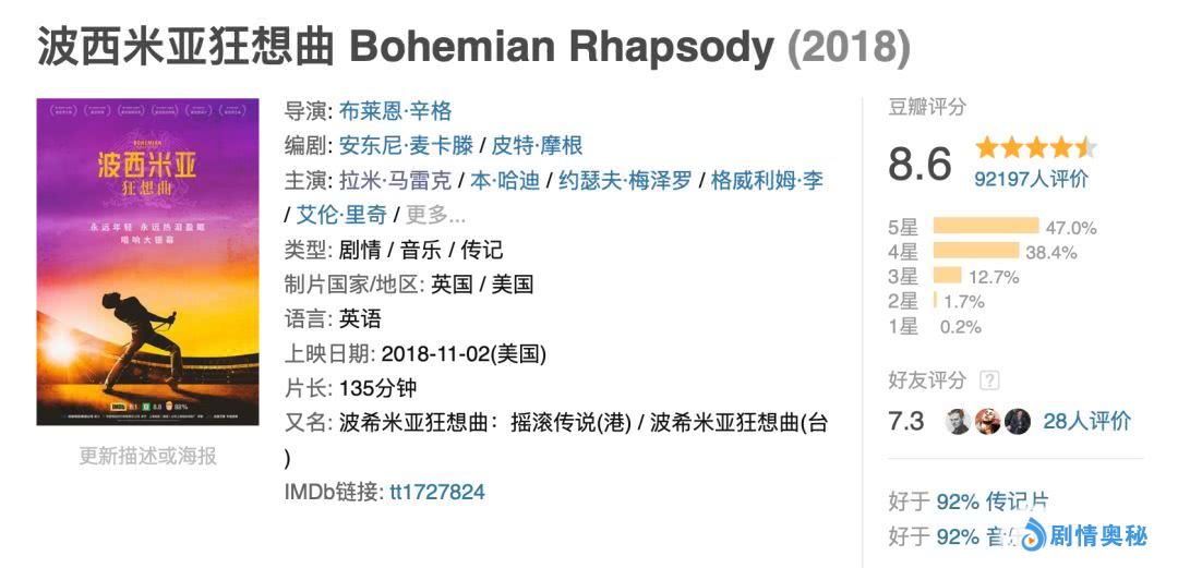 还是那样,我觉得作为传记片,其实这一部《波西米亚狂想曲》还挺普通的,总觉得有些限制太多。但是为了片尾的那场演唱会还原,还是给了四颗星,毕竟,音乐的魔力才是最大的。尤其,还惨杂了很多回忆。