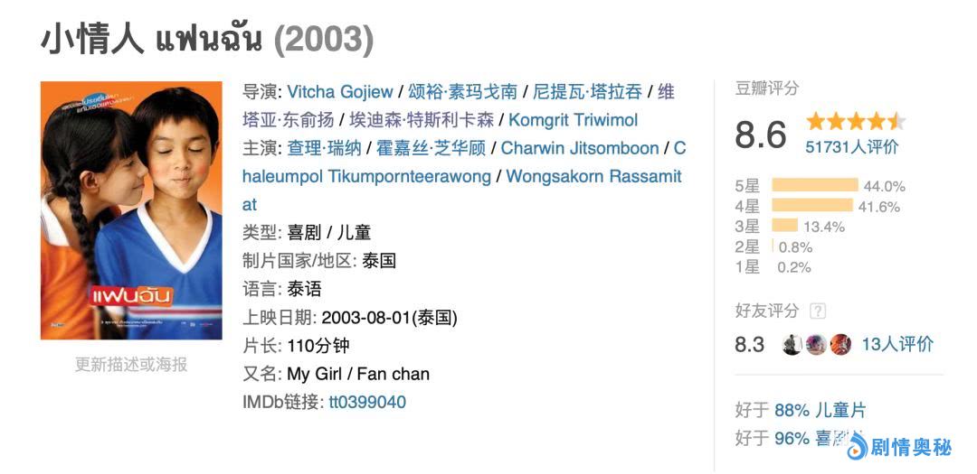 本月也有一部泰国青春片上映。导演很早之前拍过一部儿童喜剧《小情人》,在豆瓣的评价很好,有8.6分。