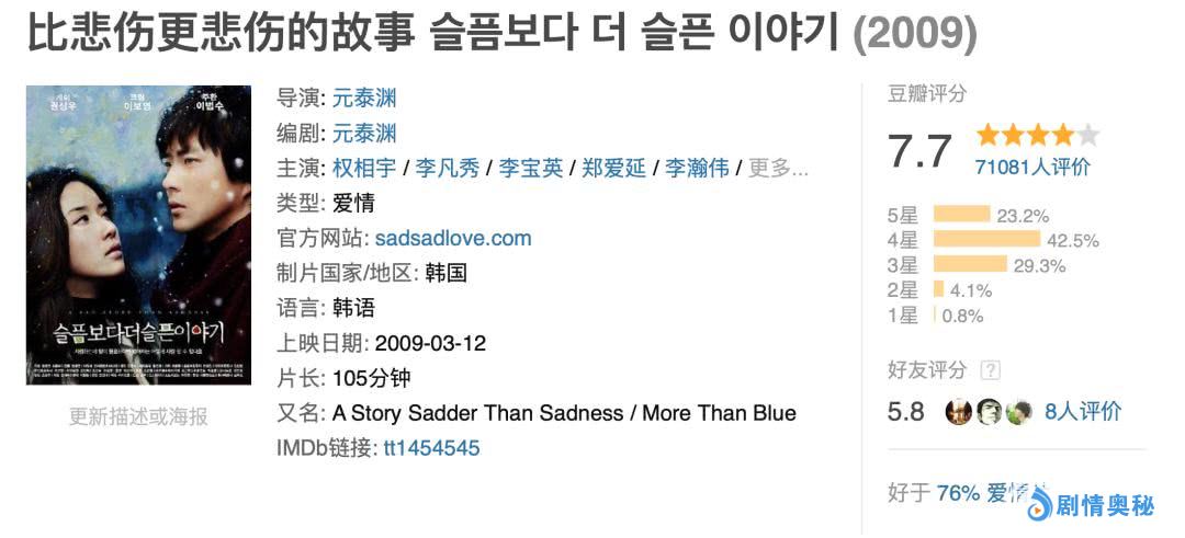 韩国原版是由权相宇和李宝英主演,在豆瓣评价很不错,有7.7分。