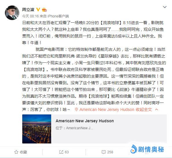 明星为吴京宣传,连唯一的徐峥最后也删除了表示赞赏的文字。所以当周立波为《流浪地球》发声,网友们也表示力挺。