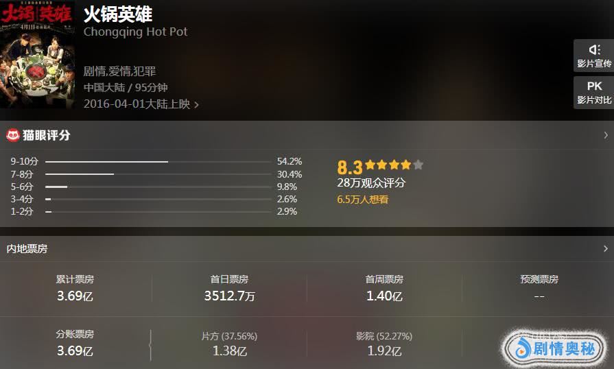 《火锅英雄》虽然是一般小成本作品,但是明星阵容却不弱,陈坤白百何都是一线巨星。该片讲述了开火锅店的三兄弟,在扩充店面时意外挖开了银行金库,由此展开了一个“惊天大案”的故事。影片上映后票房十分火爆,首日收3512万,首周进账1.4亿,最终票房狂轰了3.69亿元。