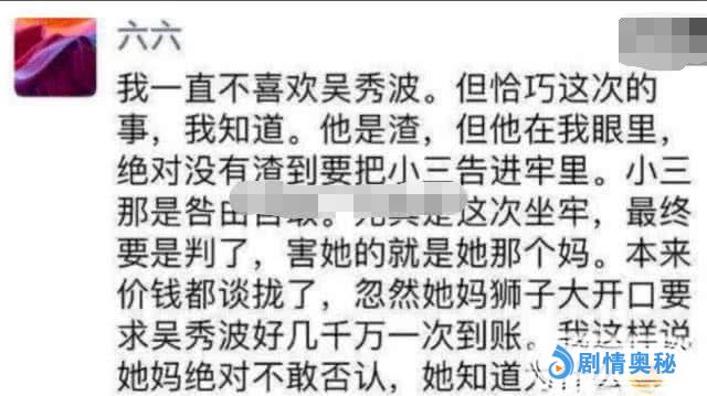 就吴秀波设圈套把陈昱霖送入狱一事,六六说虽然吴秀波是坏,但是他没有坏到会将陪了自己7年的小三送入狱了。如果说陈昱霖被害,那就只能怪陈昱霖是父母,这因为原本陈昱霖与吴秀波谈好了价钱,是陈昱霖父母要把价格要多,要了几千万,吴秀波这逼于无奈才报警把陈昱霖给抓了。最后六六也还说,对于向吴秀波要几千万一事,陈昱霖父母也绝不敢向他否认。