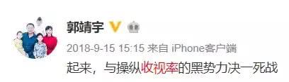2018年9月,著名电视剧导演郭靖宇发布微博,要跟操纵收视率的黑势力决一死战。