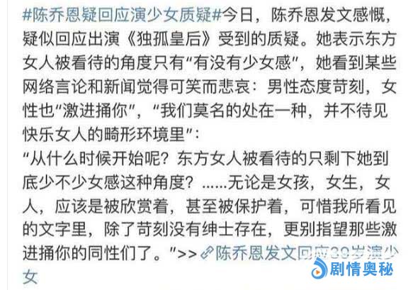 其实陈乔恩的回应,该是弄错了网友批评的重点了。网友并没有觉得一个女明星没有那么十足的少女感是一件不对的事,网友只是觉得,一个演员到了什么年龄就要演出合适的角色。很明显,在剧中她年龄比较小的时期,可以换一个年纪小一些的女演员去演,而没有必要,一定是要她本人把一个角色从小演到老。