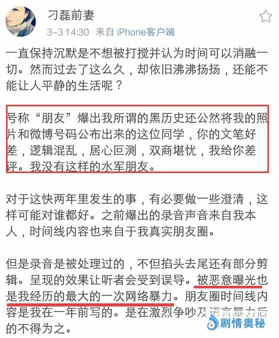 刁磊前妻怒斥说:号称“朋友”爆出我所谓的黑历史,还公然将我的照片和微博号码公布出来的这位同学,你的文笔好差,逻辑混乱,居心叵测,双商堪忧,我给你差评,我没有这样的水军朋友。