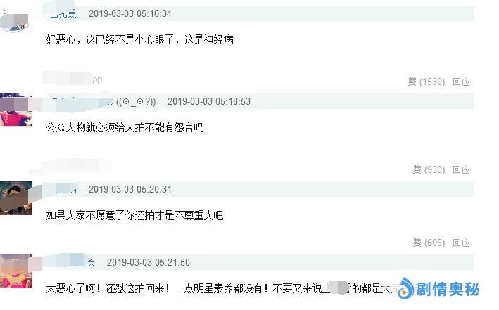吃瓜群众调侃:好恶心,这已经不是小心眼了,这是神经病!公众人物就必须给人拍不能有怨言吗?太恶心了啊!还怼这拍回来,一点明星素养都没有。