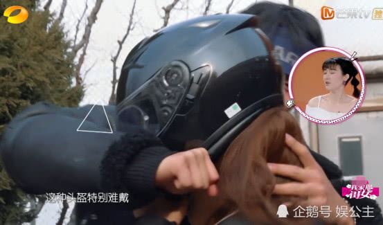 因为要骑摩托车带着吴昕去餐馆,所以得戴头盔!给吴昕戴头盔之前还问吴昕“你洗没洗头,你洗头才可以戴”!