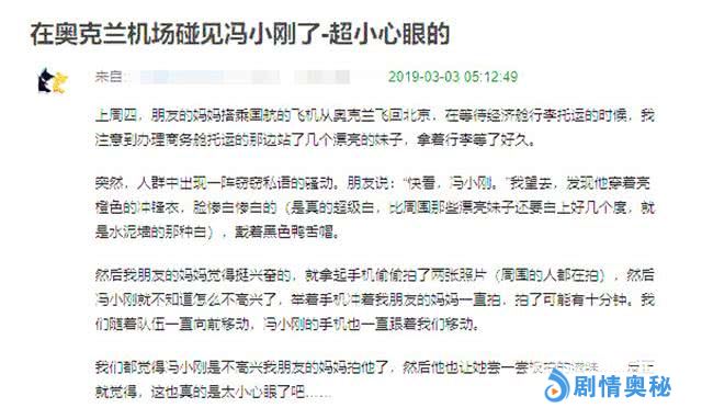 3日,网上流传出一篇帖子,有位博主称自己朋友的妈妈,在新西兰的奥克兰机场转机时,偶遇冯小刚,大妈觉得冯小刚是明星,手机偷拍了两张照片,结果被心情不佳的冯小刚发现,“报复”大妈,举着手机对大妈跟拍了十分钟,该网友发帖表示,冯小刚作为大导演,这种“报复”行为太小心眼!