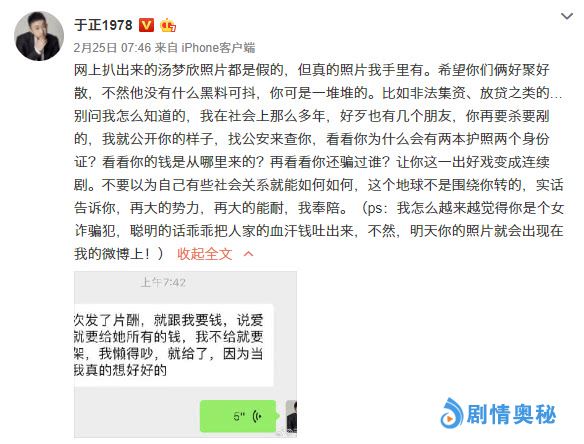 2月底,于正连续几天发微博称旗下艺人赵弈钦遭到前女友汤梦欣的威胁,不仅被榨干了血汗钱,并且还被威胁要求复合,不然就爆黑料毁掉他,于正晒出了赵弈钦给前女友的转账记录,还包括一些聊天记录,可以明显看出女方很强势。