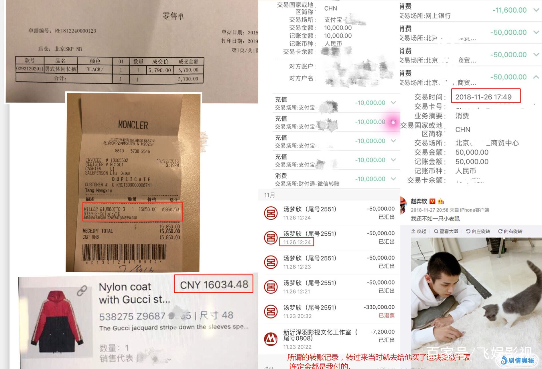 其二,汤梦欣晒出了部分消费账单,均是为赵弈钦购买的服饰,从金额上看,随便一双鞋、一件衣服都是一两万,这比一些低调的知名演员消费还高!还有一些是汤梦欣转给赵弈钦的转账记录(更详细的信息将整理提交法院),于正的爆料里完全没有提到这些,汤梦欣所说的自己给对方的更多,可信度很大。